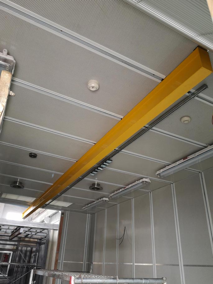 在試驗臺上方設(shè)置單軌葫蘆軌道(20#工字鋼),承載能力2T,軌道伸出屋外。并配齊掛線導(dǎo)軌及線夾。